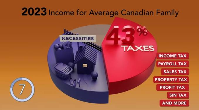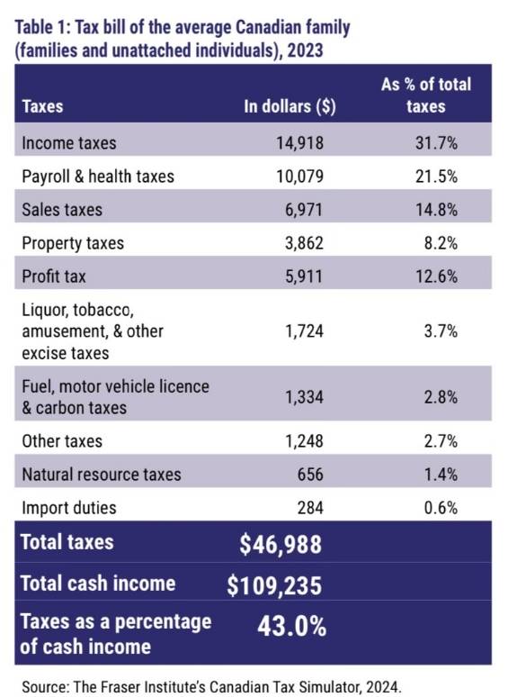 According to a new report from the Fraser Institute, last year, the average Canadian household spent more of their income on all forms of taxes (43%) than on basic necessities like food, shelter and clothing combined (35.6%).