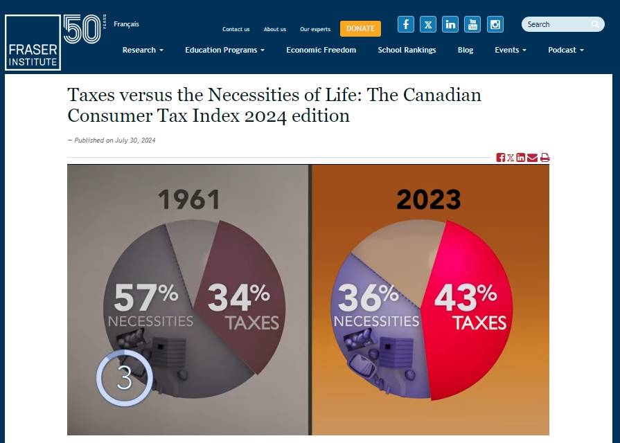 According to Taxes and Necessities: The 2024 Edition of the Canadian Consumer Tax Index, total taxes in 2023, adjusted for inflation, have increased by 180.3% since 1961.