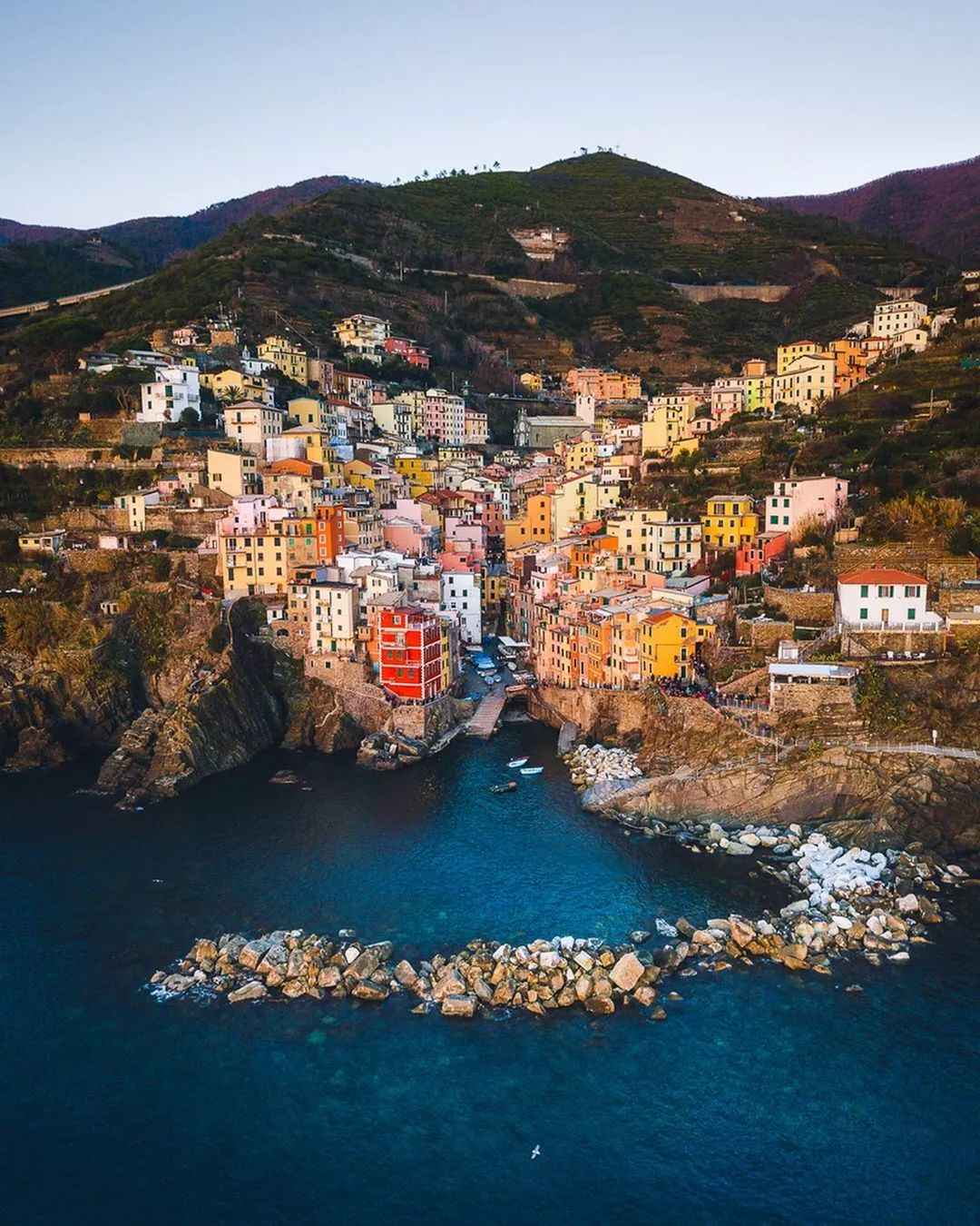 Riomaggiore in the Cinque Terre is a colorful fishing village. The houses on the cliff are scattered in a disorderly but charming way. The beautiful coastline and delicious seafood attract many tourists to take photos.