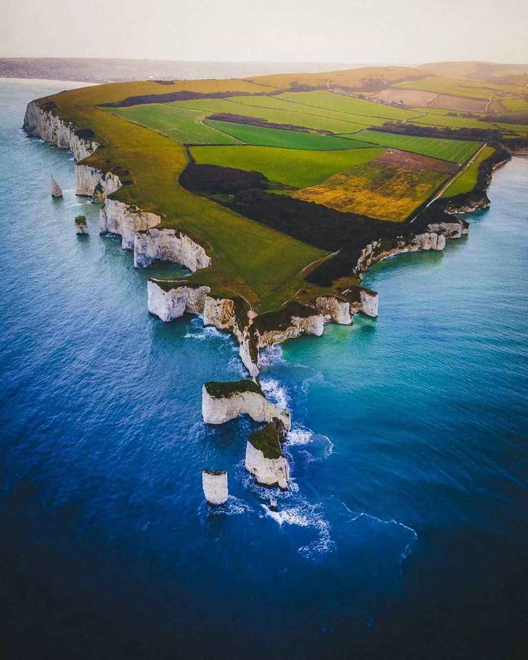 The Old Harry Rocks on the Jurassic Coast in the UK is a natural wonder. The huge white cliffs stand by the sea, and the unique geological landscape is breathtaking.
